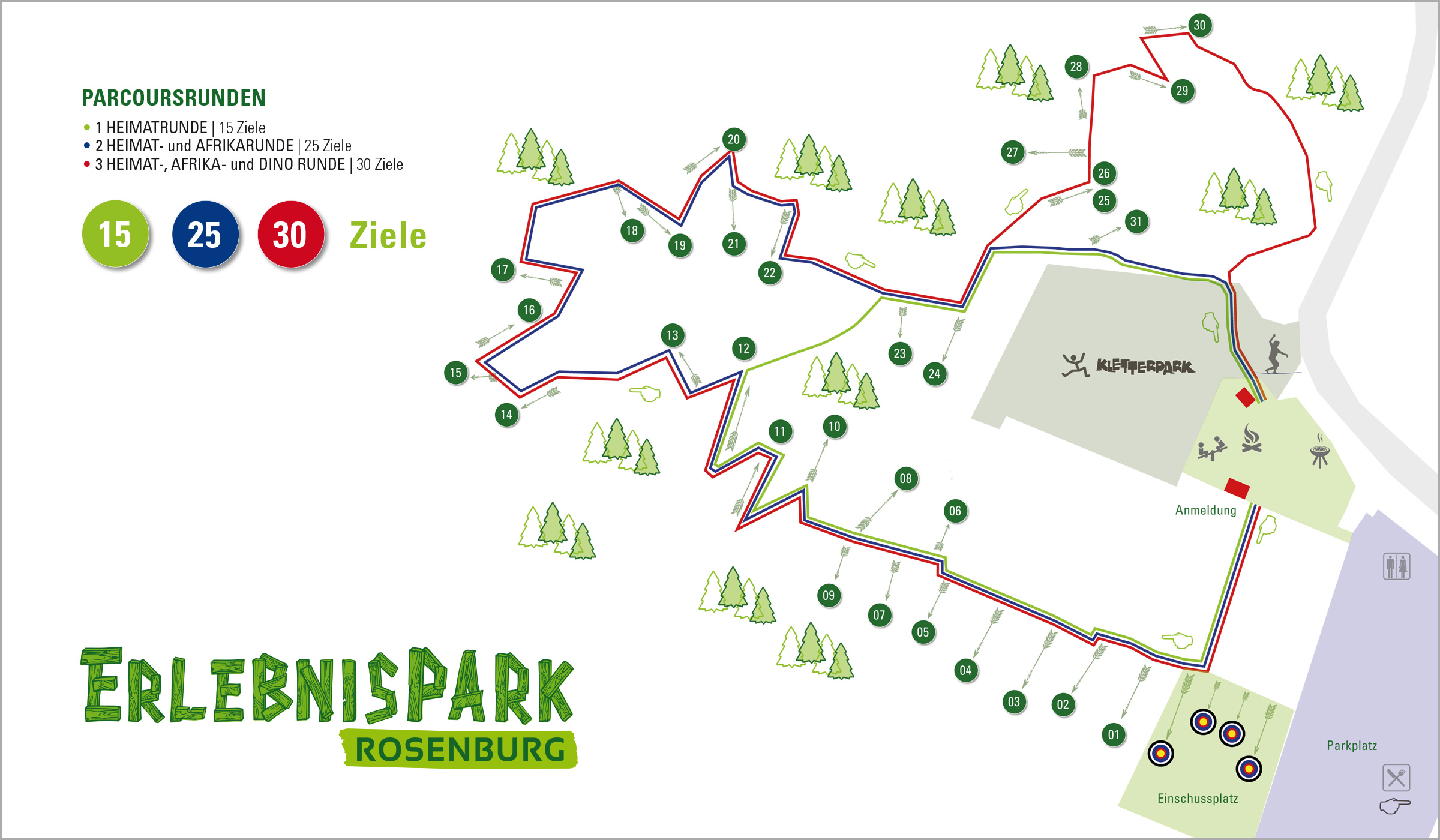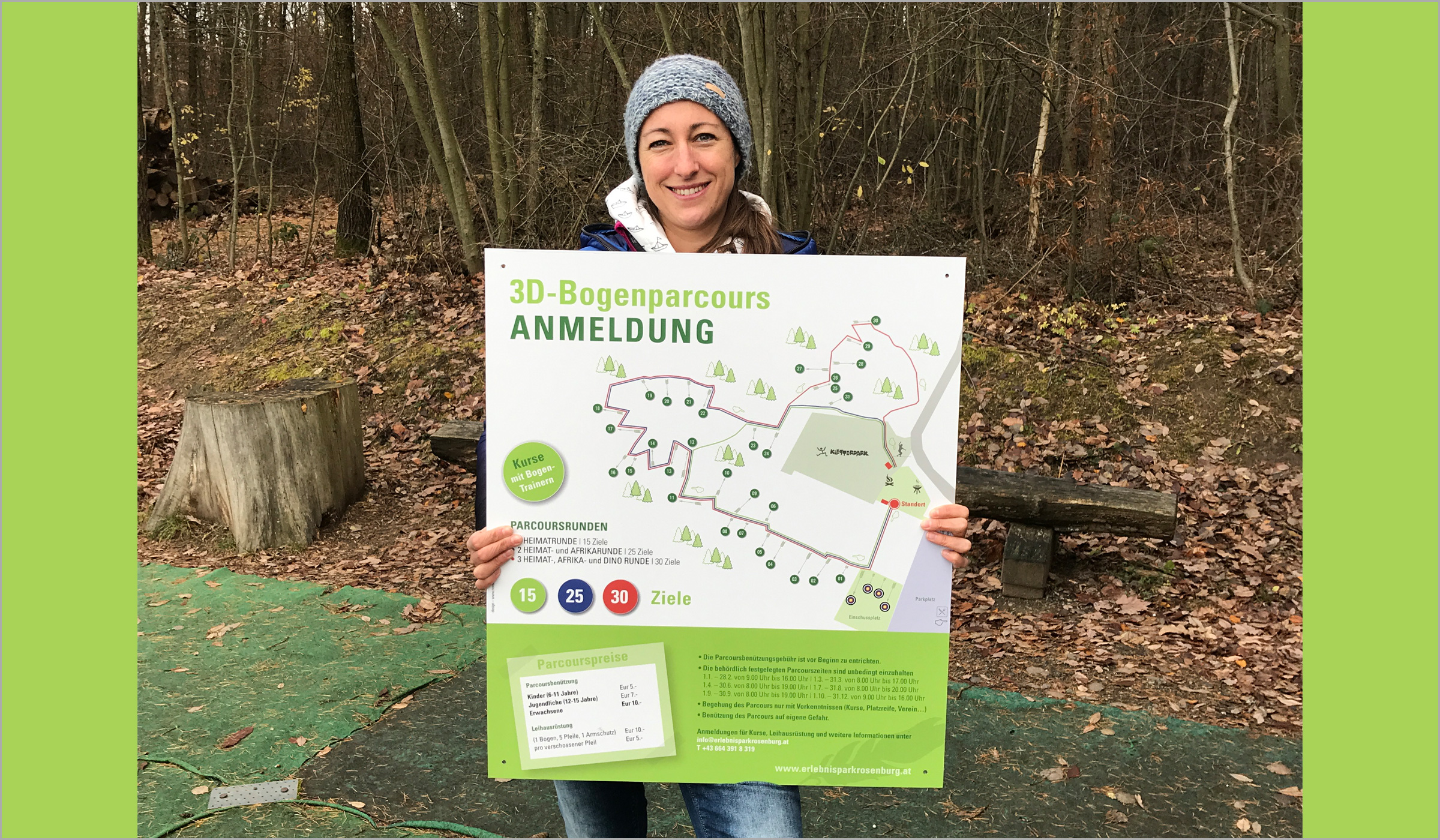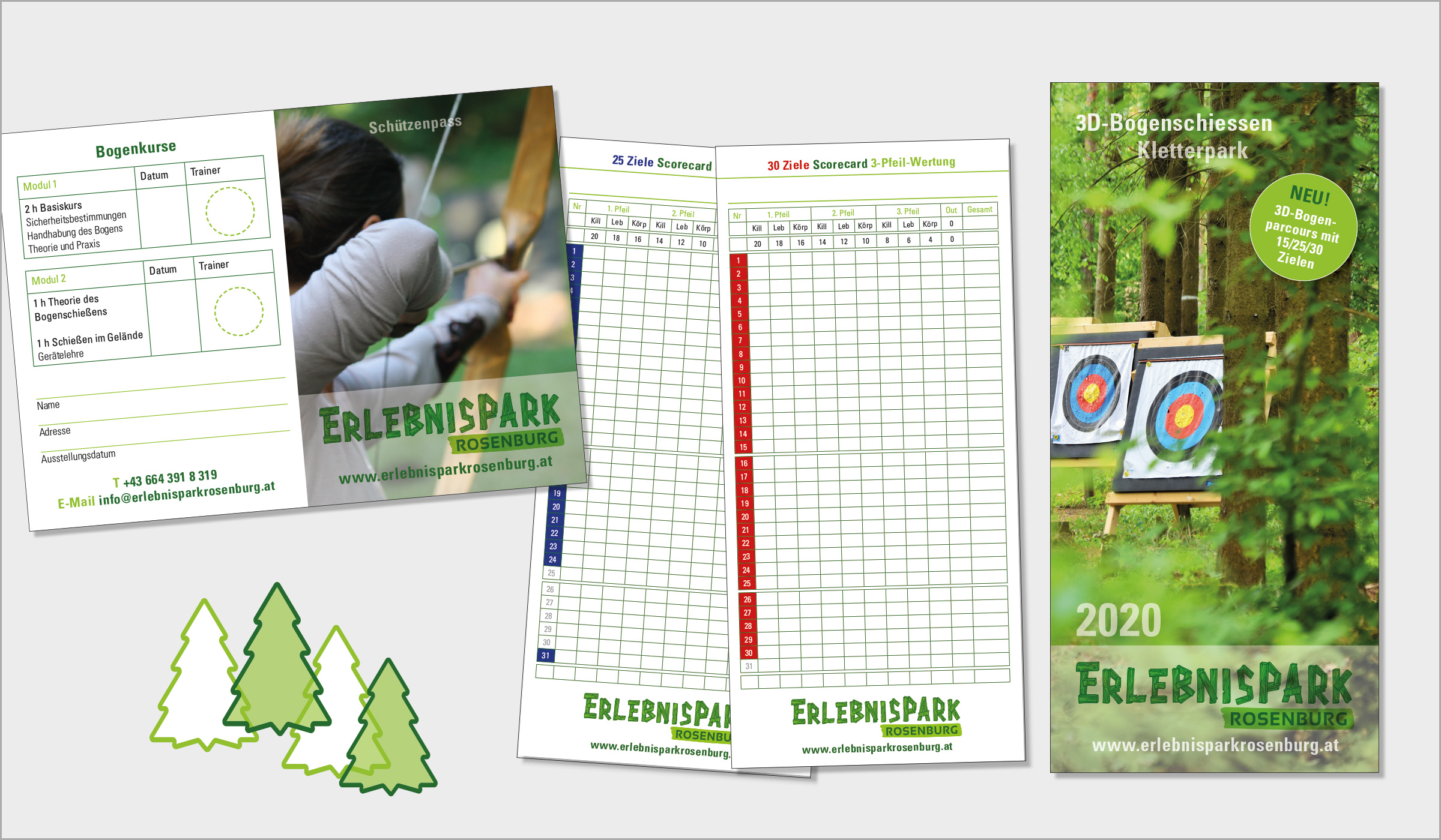 Informationsbroschüre über den Bogenparcours Rosenburg, Konzept, Design, Produktionsbegleitung; Beschilderung am Parcours für 30 Ziele mit Informationen zu den Zielen, Schützenpass, Scorzettel, Parcours-Orientierungsplan